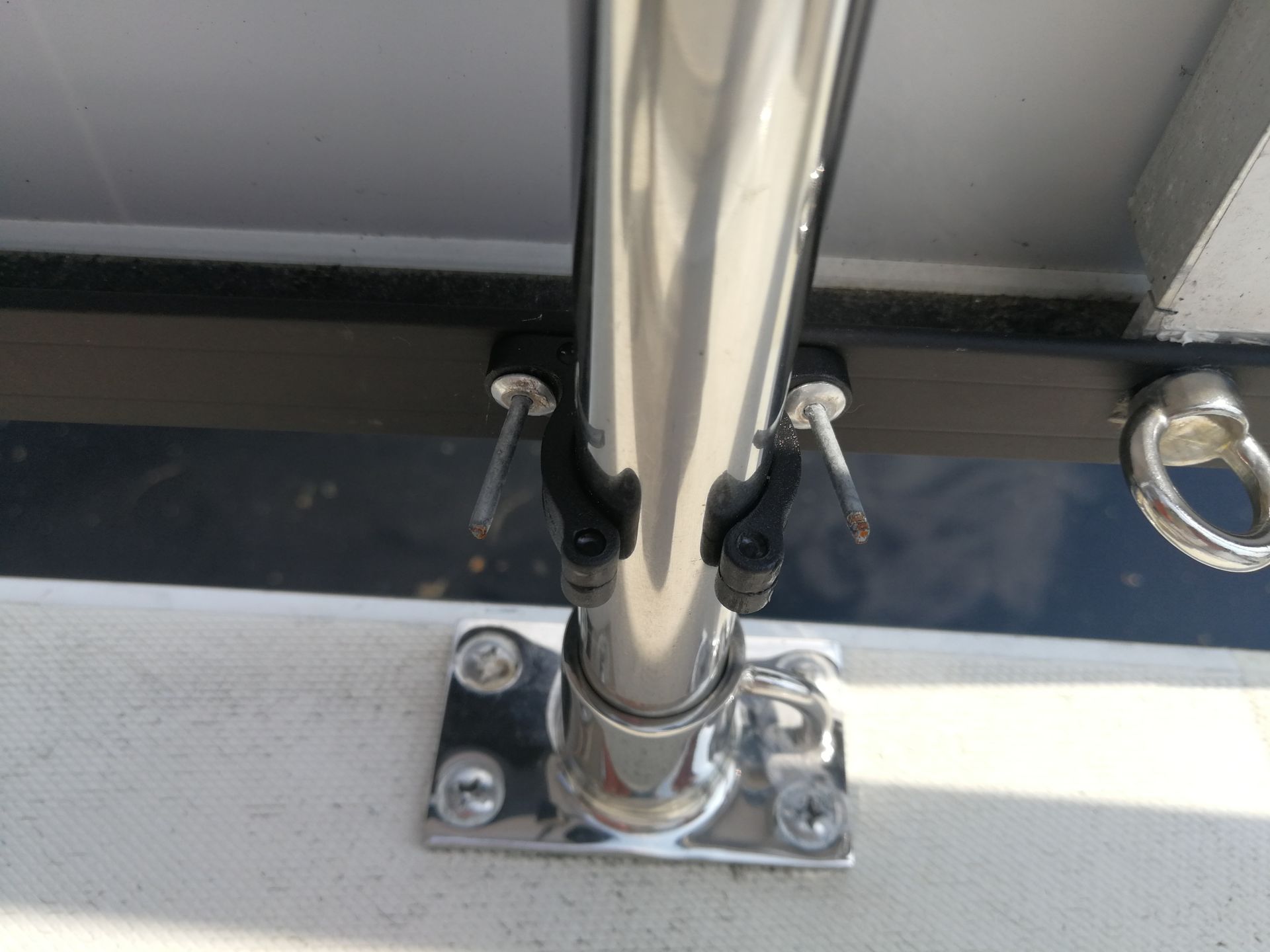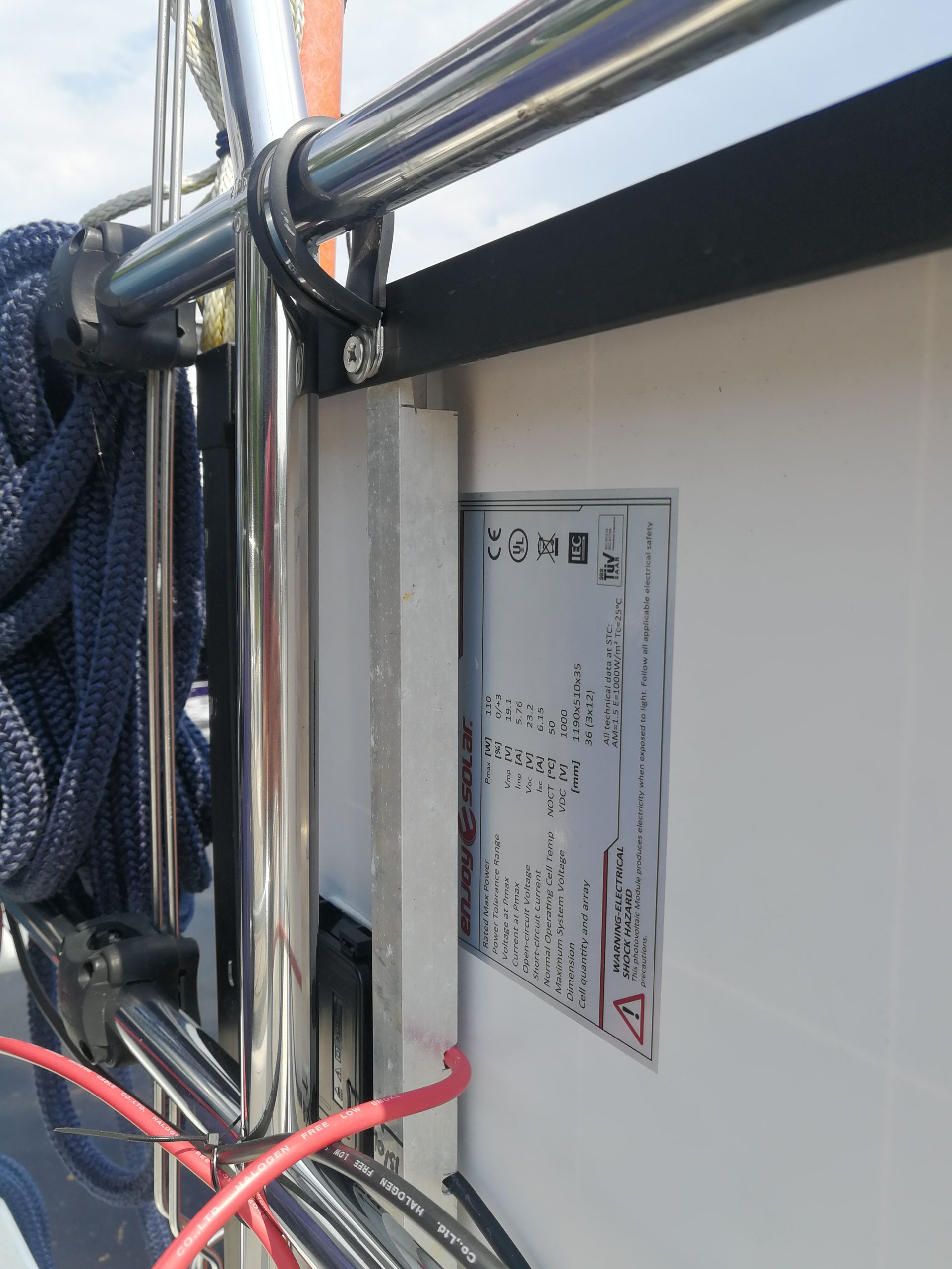 For cooking, lights, our toilet and navigational equipment we need electricity. So therefore we decided to harvest our own solar power as much as possible. The size of the panels is leading. Like many other boats our stanchion and guardrails are 61cm high. The panels we found on SolarV are 51cm. Leaving some space for water to flow away, a line to go underneath or your shoes to stick out over the toe-rail.